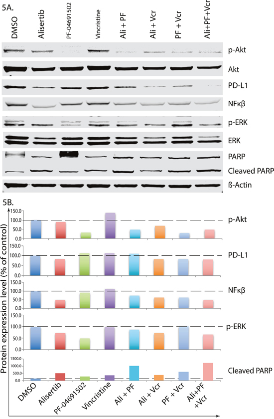 Figure 5: Alisertib plus VCR plus pan-PI3K inhibition abrogates PD-L1 induction and inhibits PTCL cell proliferation. CRL 2396 cells were treated with 50nM alisertib, 1.5μM PF04691502, 0.75nM vincristine and their combination for 4 days followed by Western blotting analyses for protein expression (A) and quantification (B).