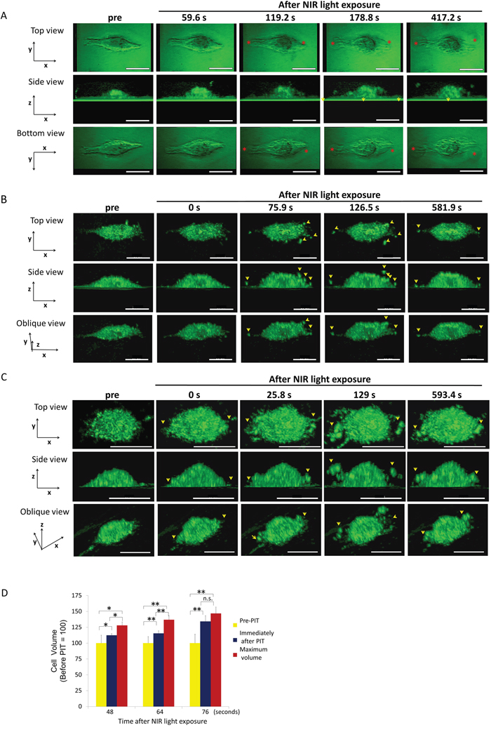 Figure 1: 3T3/Her cells increased in volume and ruptured after NIR-PIT. Representative images from 3D-LC QPM imaging depict morphological dynamics in three regimens of NIR light exposure time, 48 sec (A), 64 sec (B) and 76 sec (C). The cell in (A) initially swelled, formed blebs and ruptured. The cell in (B) and the cell in (C) ruptured without antecedent bleb formation and in (C) had already burst by the end of NIR light exposure. Red asterisk indicates a bleb. Yellow arrowhead indicates a flying fragment. See also Supplementary Videos 1-3 which are side views of cells (A, B, and C). (D) Comparison of cell volumes before and immediately after NIR light exposure and maximum volume. The cells showed significant cell volume increases after NIR-PIT. Longer NIR light exposures (76 sec), caused more damage and there was no significant difference between the volume immediately after NIR light exposure and the maximum volume. Data are means ± SE. n = 12 in 46 sec and 64 sec. n =10 in 76 sec. *P < 0.05, **P < 0.01, ***P < 0.005 versus the other group. n.s. indicates no significant difference. s indicates second or seconds.