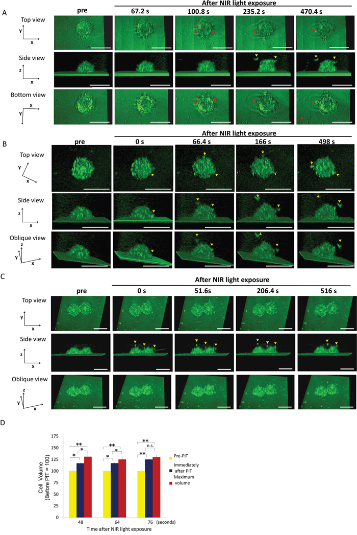 All LC-QPM Images were visualized using 3D-rendering software (FluoRender, University of Utah) and analyzed using Image J software. We manually traced the outline of each cell in all sliced sections and measured the cell volume using Image J which was compared to the pre-treated cell. The cell volume was measured by the sum of cross-sectional area of transverse sections at 0.28 μm intervals and calculated the rate of volume increase after NIR-PIT.