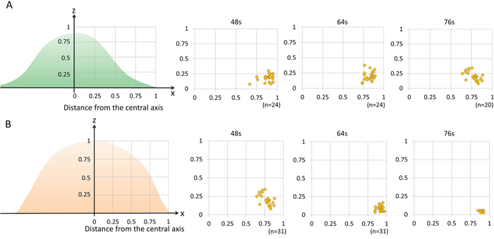 Figure 3: The distribution of blebbing and cell rupture on the cell membrane vs. distance from the thickest part of the cell. 3T3/Her cells (n = 24 in 48 sec and 64 sec, n = 20 in 76 sec) (A) and MDA-MB468 cells (n = 18 in 48 sec, n = 31 in 64 sec, n = 10 in 76 sec) (B). Both cell types showed that damage occurred primarily in the outer one fourth of the cell membrane close to where the free margin of the cell joins the adherent cell membrane. s indicates seconds.
