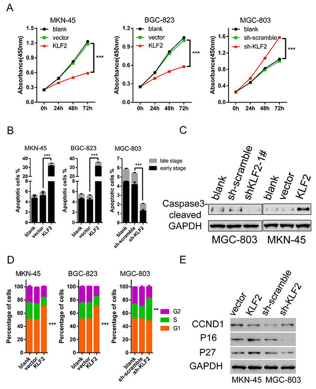 Figure 3: KLF2 inhibits cell proliferation and induces cell apoptosis and cell cycle arrest. (A) Alteration of KLF2 influenced the proliferation of MKN-45, BGC-823 and MGC-803 cells by CCK8 assay at different time points. KLF2 overexpression significantly inhibited MKN-45 and BGC-823 cell proliferation. Knockdown of KLF2 enhanced cell proliferation in MGC-803 cells. *** P < 0.001. (B) Percentage of apoptotic cells, including early and late stage, in KLF2 overexpressing and deficient cell lines was determined after analyzing Annexin V and PI double labeled cells through FACS. *** P < 0.001. (C) Levels of apoptosis-associated marker protein cleaved caspase 3 was determined via Western blot in KLF2 overexpressing MKN-45 cells and KLF2 deficient MGC-803 cells. (D) Comparison of cell cycle distribution in KLF2 overexpressing and deficient cell lines, based on FACS analysis. (E) Protein expression of cell cycle regulators such as p16/ CDKN2A, p27/CDKN1B and CCND1 in KLF2 overexpressing MKN-45 cells and KLF2 deficient MGC-803 cells.
