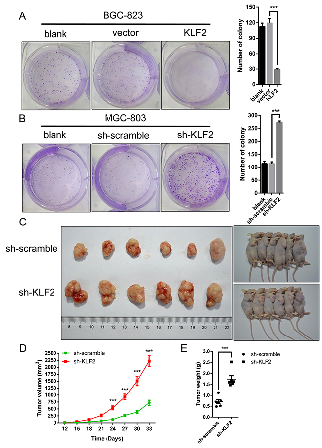 Figure 5: KLF2 suppresses cell growth in vitro and gastric tumor formation in vivo. (A and B) Colony formation assays were performed to determine the proliferation of BGC-823 and MGC-803 cells. The colonies were counted after fixation and staining with crystal violet and are shown in the right panel. Data are mean ± SD of three independent experiments. *** P < 0.001. (C) Representative pictures showing the effects of KLF2 on tumor growth, as determined in a xenograft mouse model. KLF2 deficient MGC-803 cells were injected into nude mouse flanks. Tumor size was measured every 3 days and the growth curves were shown in (D). Tumors were harvested and weighed after one month as shown in (E) *** P < 0.001.