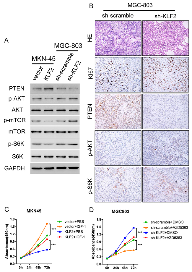 Figure 6: KLF2 activation of PTEN results in reduced Akt-mTOR signaling in GC cells. (A) KLF2 overexpressing MKN-45 cells and KLF2 deficient MGC-803 cells were subjected to Western blot to determine the expression of PTEN, and p-AKT signaling and its downstream substrates p-mTOR and p-S6K. (B) HE staining and immunohistochemical staining of KI67, PTEN, p-AKT and p-S6K in KLF deficient MGC-803 cell-derived xenograft tumors. (C and D) Administration of AKT pathway activator IGF-1 and AKT inhibitor AZD5363 significantly reversed the cell proliferation phenotype determined by the CCK8 assay. *** P < 0.001.