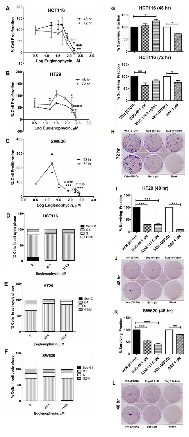 Figure 2: Euglenophycin inhibits proliferation and clonogenicity of HCT116, HT29, and SW620 colon cancer cell lines. (A-C) MTT cytotoxicity assay; (D-F) quantified cell cycle analysis by propidium iodide staining and flow cytometry (representative images are in Supplementary Figure 1) after 48 hr toxin treatment; (G-L) colony formation assay visualized by crystal violet with quantified values and representative images: (G) and (H), HCT116; (I) and (J), HT29; (K) and (L), SW620. Values indicate mean ± SE (from three independent experiments). Eug is euglenophycin; Baf is Bafilomycin A; Veh is vehicle control (0 μM). (A-C) *p<0.05, **p<0.01 at 48 hr and ɸɸp<0.01, ɸɸɸp<0 at 72 hr. (D-H) * p<0.05, **p<0.01, *** p<0.001.