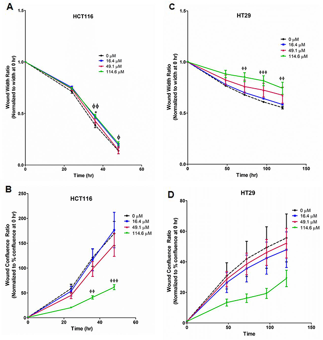 Figure 4: Suppression of migratory potential by euglenophycin (EUG) is cell type-dependent. Wound healing measured by two parameters, wound width and wound confluence. Scratch assay quantification with (A) and (B), HCT 116; (C) and (D), HT 29. Representative images are in Supplementary Figure 3. *p ≤ 0.05 EUG 0 μM vs 16.4 μM; ɸp ≤ 0.05 EUG 0 μM vs 114.6 μM; ɸɸp ≤ 0.01 EUG 0 μM vs 114.6 μM; ɸɸɸ p ≤ 0.001 EUG 0 μM vs 114.6 μM; values indicate mean ± SE; n=8 per treatment group.