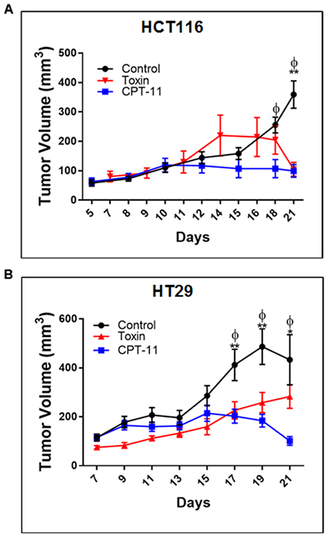 Figure 5: Euglenophycin inhibits in vivo tumor growth of colon cancer cells similarly as CPT-11 (standard chemotherapeutic) in mouse xenograft models. Tumor volumes (n=10 per cell line) of mice injected with (A) HCT116 and (B) HT29 cells, respectively. *p ≤ 0.05 control vs toxin (EUG); **p ≤ 0.001 control vs toxin; ɸp ≤ 0.001 control vs CPT-11; values indicate ± SD. Intraperitoneal administration of CPT-11 or euglenophycin were done daily from day 10 to day 15 post-implantation.