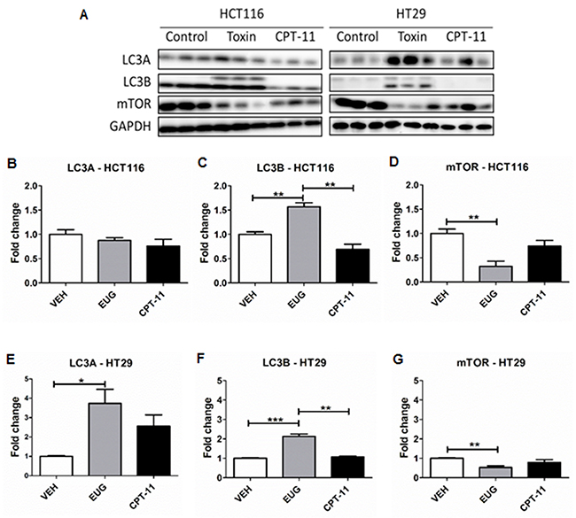 Figure 6: Euglenophycin (EUG) modulated protein expression of autophagy markers in HCT116 and HT29 xenografts. Representative western blot is presented in (A) and quantification is shown in (B-G). * p ≤ 0.05; ** p ≤ 0.01; *** p ≤ 0.001; values indicate mean ± SE (analyzed 3 tumors per group for each cell type).