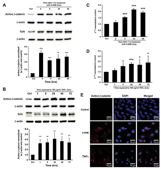 Previous studies by us showed that 4-HNE and TNFα were mediators for MIBE [16, 20, 24]. To determine whether these mediators could directly activate Wnt/β-catenin signaling, YAMC cells were treated with purified 4-HNE and TNFα. Western blots showed increased active β-catenin, Tcf4, and inactive p-Gsk3β after a 1 hr-treatment with 4-HNE (Figure 3A and Supplementary Figure 2B). TNFα similarly induced active β-catenin, Tcf4, and inactive p-Gsk3β (Figure 3B and Supplementary Figure 2C). qRT-PCR confirmed increased gene expression of Ctnnb1 at 5 to 48 hrs following 4-HNE treatment (Figure 3C). Increased expression of Ctnnb1 was also noted in cells treated with TNFα at 24 to 72 hrs (Figure 3D). Finally, staining for active β-catenin showed nuclear translocation for YAMC cells treated with 4-HNE or TNFα compared to untreated controls (Figure 3E). These findings show that these MIBE mediators can each independently induce Wnt/β-catenin signaling in colon epithelial cells.