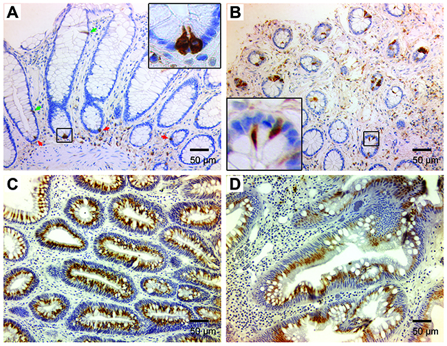 Figure 6: DCLK1 expression is increased in human colon adenomas and colorectal cancer. (A), Immunohistochemical staining for DCLK1 shows rare DCLK1+ cells in normal human colon at the bottom (red arrows) and upper portion (green arrows) of colon crypts (20x). Inset (100x) shows staining pattern for DCLK1+ cells at the crypt bottom. (B), DCLK1+ cells are seen in hyperplastic polyps (20x). Inset (100x) shows a different staining pattern. (C) and (D), DCLK1 staining is markedly increased for tubular adenomas (C) and invasive colorectal carcinomas (D).