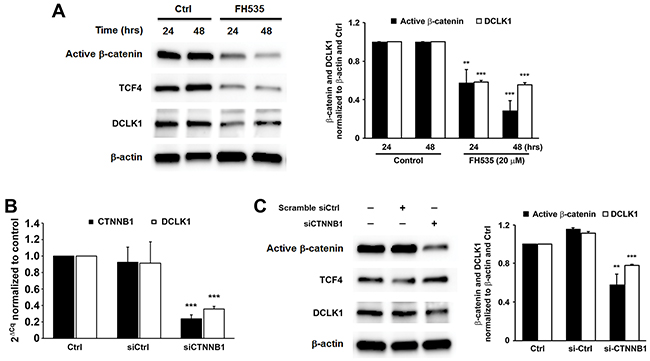 Figure 7: Wnt/β-catenin regulates DCLK1 expression in human colorectal cancer. (A), Inhibition of β-catenin/TCF4 by FH535 decreases DCLK1 expression in HCT116 colon cancer cells. (B), qRT-PCR shows significantly decreased expression of DCLK1 in CTNNB1-silenced HCT116 cells compared to controls. (C), Western blots demonstrate that silencing CTNNB1 in these cells has no effect on TCF4 expression but decreases DCLK1 expression. ** P < 0.01 and *** P < 0.001 compared to Ctrl. All data represent mean ± SD for 3 independent experiments.