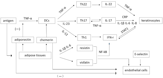 The adipokines can play anti-inflammatory or pro-inflammatory roles in the systemic inflammation in psoriasis patients [74]. In inflammatory state underlying psoriasis, resistin produced mainly by monocytes and macrophages in adipose tissue, could stimulate the secretion of pro-inflammatory cytokines, TNF-α and IL-12, by monocytes in NF-kB-dependent manner. Resistin increases expression of adhesion molecules and production of chemokines in endothelial cells contributing to immune cells infiltration [87, 88]. The expression of resistin is modulated by IL-1β and IL-6 [29, 73]. Chemerin, mainly produced by white adipose tissue, is also expressed by keratinocytes and endothelial cells [89–91]. Its production is increased by IL1β and TNF-α [92–94]. Chemerin stimulates adipocytes and endothelial cells and may increase angiogenesis in psoriatic skin [90, 95, 96]. Chemerin can induce chemotaxis of plasmatoid dendritic cells (pDCs) and immature myeloid DCs in developing skin lesions of psoriasis patients [82].