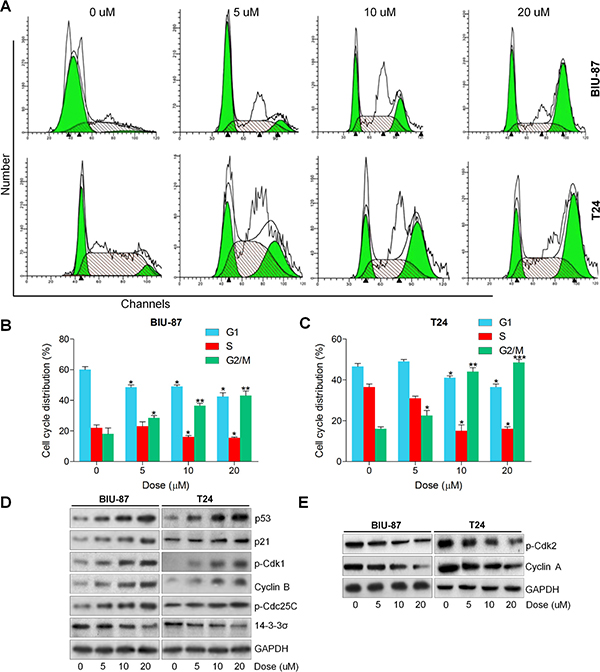 In this regard, to verify if the growth suppression caused by ACT is associated with cell cycle arrest, the role of ACT in the cell cycle distribution was measured. As shown in Figure 2A–2C, the proportion of bladder cancer cells at G1/S was significantly decreased after ACT treatment, while the percentage of cancer cells at G2/M phase was markedly increased owing to ACT treatment (0, 5, 10, and 20 uM) for 24 h. Subsequently, the cell cycle-associated molecules were evaluated using western blot analysis. The results exhibited that ACT enhanced p53, p21, p-Cdk1, Cyclin B and p-Cdc25C, while reduced 14-3-3σ in a dose-dependent manner, which were related to the regulation of G2/M cell cycle arrest (Figure 2D). In contrast, p-Cdk2 and Cyclin A were dose-dependently down-regulated by ACT, associated with the reduction of G1/S phase (Figure 2E). In conclusion, the findings above suggested that ACT induced G2/M cell cycle arrest through modulating the important signals of G2/M cell cycle transition-phase.