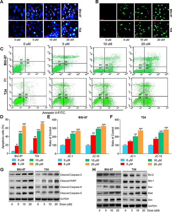 Figure 4: Actein induces apoptosis in human bladder carcinoma cells. (A) BIU-87 and T24 cells were incubated with ACT for 24 h, followed by Hoechst 33258 analysis. (B) TUNEL assays were applied to explore the apoptosis in cells. (C) Bladder cancer cells were cultured with ACT for 24 h, and then analyzed through flow cytometry. (D) The apoptosis proportion of bladder cancer cells was shown following flow cytometry. (E, F) BIU-87 and T24 cells were treated with ACT for 24 h, and then the mitochondrial membrane potential was verified through measuring JC-1 and JC-10 levels. And the ratio of control was displayed. (G) Western blot analysis of cleaved Caspase-3, PARP, Caspase-8 and Caspase-9. (H) The western blot analysis of Bcl-2, Mcl-1, Bax, Bad and Bim. Data are represented as mean ± S.E.M. *p < 0.05, **p < 0.01, ***p < 0.001 versus the untreated group.