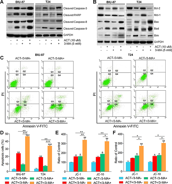 Figure 5: Actein-induced apoptosis is enhanced by suppressing autophagy. BIU-87 and T24 cells were pre-incubated with 3-MA for 2 h, followed by ACT treatment for another 24 h. (A, B) Then, western blot analysis was used to evaluate the apoptosis-related signals. (C) BIU-87 and T24 cells were pre-treated with 3-MA for 2 h, followed by ACT exposure for another 24 h. Then, all cells were harvested for flow cytometry analysis to assess the apoptosis. (D) The quantification of apoptosis proportion was exhibited following the flow cytometry assays. (E, F) BIU-87 and T24 cells were treated as described, and then the mitochondrial membrane potential was measured through assessing JC-1 and JC-10 levels. The ratio of control was exhibited. Data are represented as mean ± S.E.M. *p < 0.05, **p < 0.01, ***p < 0.001 versus the untreated group; +p < 0.05, ++p < 0.01 and +++p < 0.001.