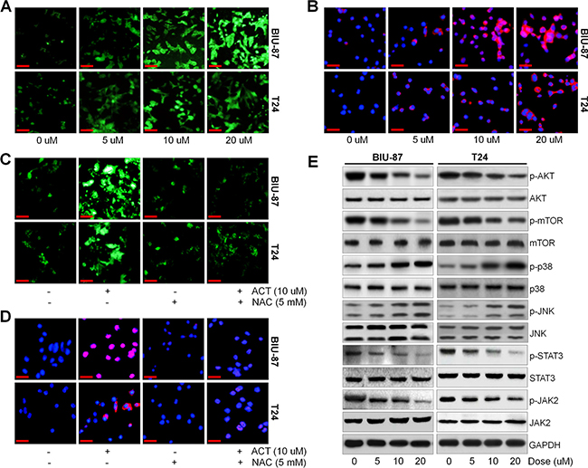 Figure 6: Actein potentiates ROS/JNK, and suppresses AKT pathway. (A) BIU-87 and T24 cells were treated with different doses of ACT for 24 h, and then all cells were collected for DCF analysis to calculate the generation of ROS using fluorescent microscope. (B) BIU-87 and T24 cells were stained with MitoSOX Red after various treatments, and then the ROS levels were examined through confocal microscope. (C, D) The bladder cancer cells were pre-treated with ROS scavenger of NAC (5 mM) for 2 h, and then all cells were subjected with or without ACT (10 uM) for another 24 h, followed by DCF and MitoSOX Red staining using confocal microscope. (E) BIU-87 and T24 cells were treated with ACT for 24 h, and then p-AKT, p-mTOR, p-p38, p-JNK, p-STAT3 and p-JAK2 protein levels were evaluated using western blot analysis. Data are represented as mean ± S.E.M.