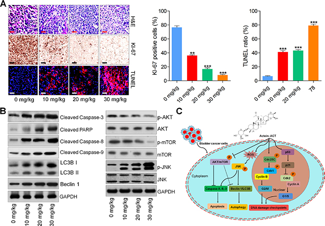 H&E staining of tumor tissue sections indicated that ACT reduced the number of tumor cells. And the immunohistochemical analysis suggested lower levels of KI-67 positive cells while higher levels of TUNEL-positive cells in ACT-treated tumors, which were comparable to the control ones (Figure 8A and 8B). In addition, western blot analysis demonstrated that ACT improved the expression levels of cleaved Caspase-3, PARP, Casapse-8 and Caspase-9, as well as LC3BI/II and Beclin 1, which are associated with apoptosis and autophagy. p-AKT and p-mTOR were dose-dependently reduced by ACT, whereas JNK phosphorylation was elevated in tumor tissue segments (Figure 8B). In conclusion, the data above indicated that ACT suppressed human bladder cancer growth in vivo through inducing apoptosis and autophagy.