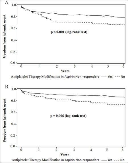 The definition used for antiplatelet therapy modification (ATM) was any change in the patient’s antiplatelet regimen within 24 hours after the platelet function testing result was made available. Change in antiplatelet therapy was defined as any increasing the dosage of aspirin (200 mg/d increase to 300 mg/d), adding an additional antiplatelet agent to aspirin (add clopidogrel to aspirin), or switching to a more potent antiplatelet agent (eg, change from aspirin to clopidogrel or cilostazol). The following patients needed to receive ATM: (1) aspirin non-responders, and these non-responders were willing to receive ATM; (2) side effects of aspirin, such as allergic to aspirin, gastrointestinal bleeding, skin or mucosal bleeding, and severe nausea and vomiting. For the patients with side effects of aspirin, aspirin was switched to clopidogrel or cilostazol. For aspirin non-responders, one following ATM was selected: (1) increasing the dosage of aspirin; (2) adding an additional antiplatelet agent to aspirin; (3) switching to a more potent antiplatelet agent. This was a multi-center, retrospective study, not a randomized-controlled trial. In addition, up to date, there are no standardized treatment recommendations for the aspirin non-responders. Thus, the diverse modifications in antiplatelet regimens used after platelet function testing were at the discretion of the treating physician in this study.