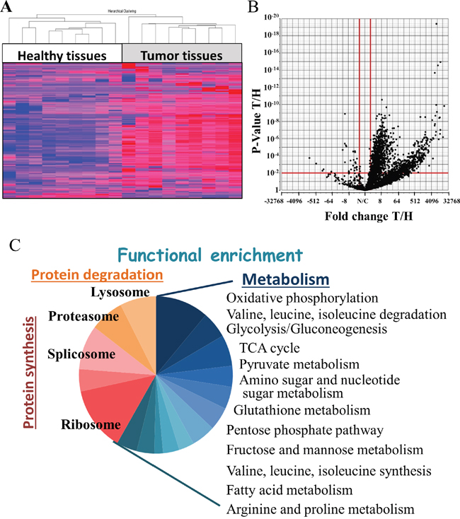 Next, functional analysis of the proteins differentially expressed between cancerous and healthy lung tissues was performed using the DAVID Gene ontology databases [14, 15]. Such analysis revealed enrichment of proteins related to protein synthesis and degradation, and in particular, of proteins assigned roles in metabolism and to the mitochondria (Figure 1C) (Supplementary Table 5).