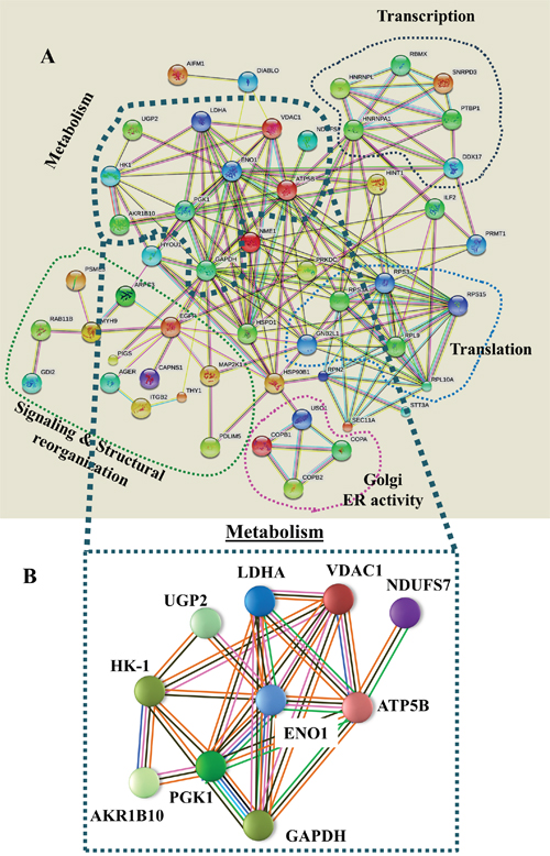 Network analysis (Figure 4) of the proteins identified here by proteomics demonstrated that most of these proteins interact at several levels, with metabolic process-related proteins being central. These interactions include common functionalities associated with cell metabolism, and involve direct physical interaction with each other. Indeed, many are co-expressed and can be defined as being encoded by a cluster of genes that is regulated by epigenetic modification.