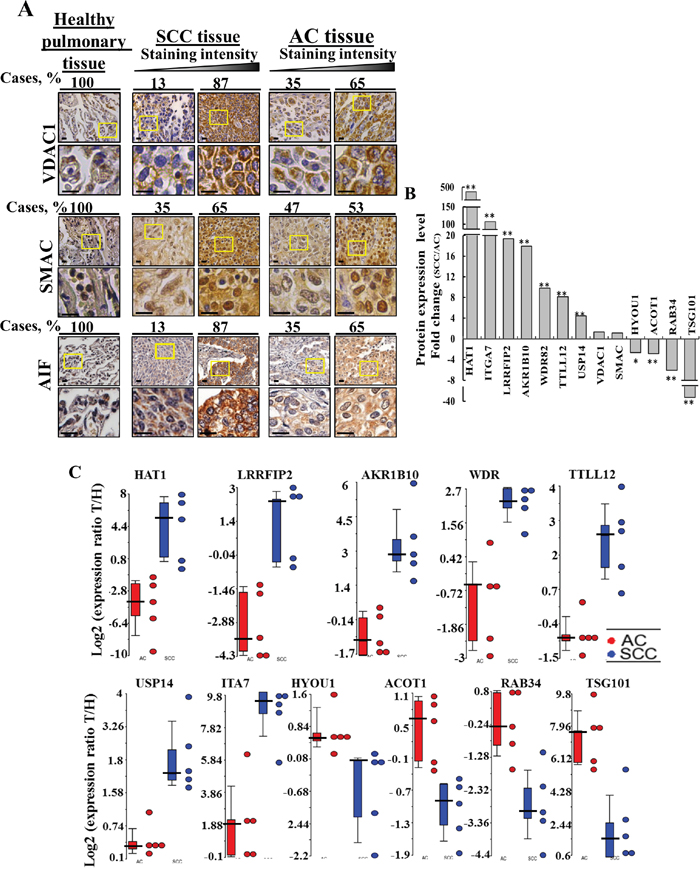 Figure 5: Proteins differentially expressed in AC and SCC. (A) Tissue array slides (US Biomax) containing human Healthy lung tissue (n=10), lung SCC tissue (n=31) and lung AC tissue (n=21) were stained for VDAC1 and AIF while healthy lung tissue (n=20), lung SCC tissue (n=72) or lung AC tissue (n=72) were stained for SMAC, as described in Supplementary Data. The percentages of patient sample-derived sections stained at the intensity indicated are shown (Cases, %). (B) LC-HR MS/MS data were used to identify proteins that can serve to distinguish between AC and SCC. A difference between AC and SCC groups was considered statistically significant when P< 0.05 (*), P< 0.01 (**) or P < 0.001 (***) as determined by the Mann-Whitney test. (C) Scatter plots display the expression levels (from LC-HR MS/MS data) of TTLL12, AKR1B10, USP14, LRRF2, HAT1, TSG101, WDR, ACOT1 as the log2 ratio of healthy to tumor for AC and SCC after zero intensities were replaced with 1. To eliminate inflated ratios caused by division by 1, log2 ratios larger than 10 (~1000 fold in linear scale) were replaced by 10. For each protein, a t-test was carried out between the log2 ratios of the SCC patients and the log2 ratios of the AC patients. A total of 10 proteins had nominal p-value < 0.01. No protein had FDR adjusted p-value < 0.1. Statistics were calculated with GraphPad Prism software. Horizontal lines represent mean values for each group.