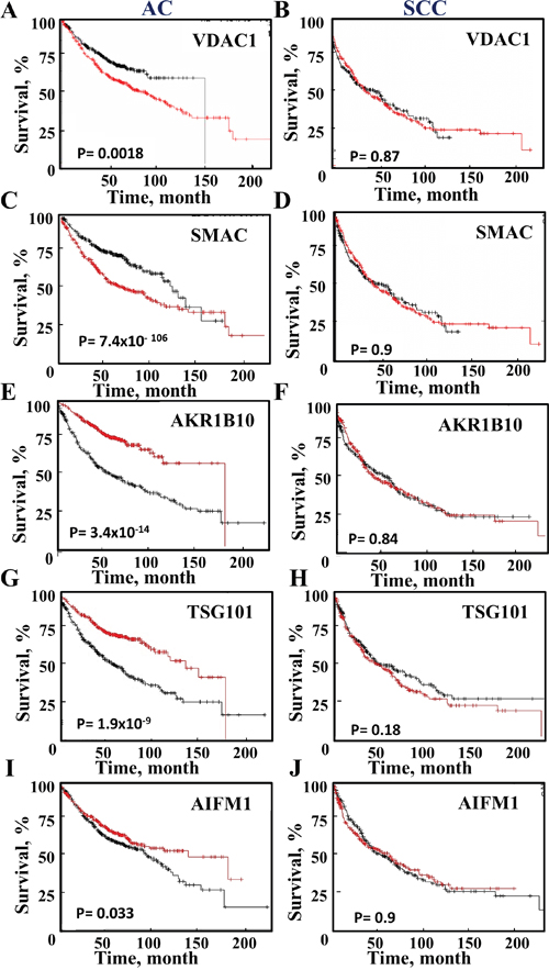 To further test the prognostic value of the proteins proposed to distinguish between AC and SCC, survival analysis was performed on publicly available gene expression datasets of lung cancer patients (Figure 7). A Kaplan-Meier analysis assessing patient survival as a function of the relative indicated mRNA levels (high, red and low, black) in AC and SCC was performed. The results show that in AC patients, high levels of VDAC1, SMAC or HYOU1 are associated with low survival rates, while high levels of AKR1B10, AIF and TSG101 are associated with higher survival rates (Figure 7). In contrast, the expression levels of these proteins had no effect on SCC survival rates (Figure 7). A summary of the results with respect to survival and mRNA expression levels and the time for 50% death for AC and SCC patients is presented in Supplementary Table 8.