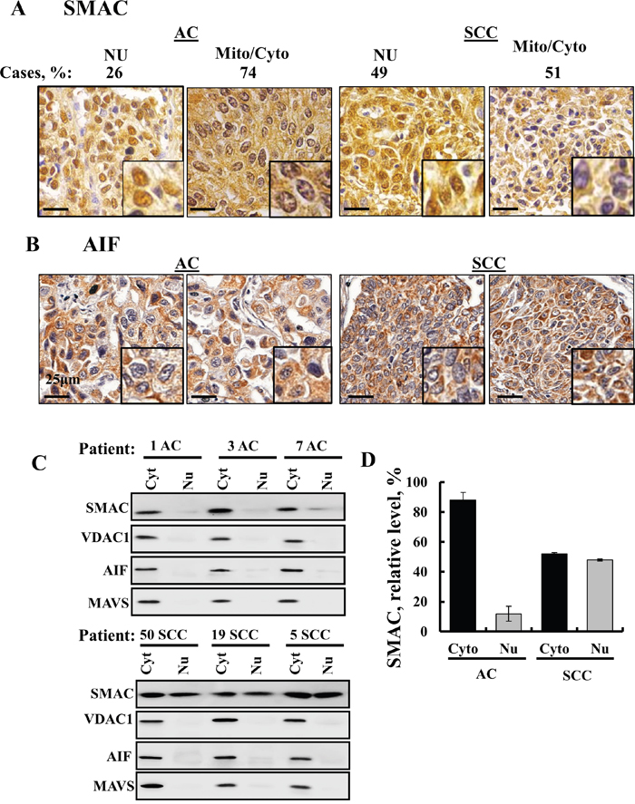 Interestingly, analysis of SMAC expression in a tissue array of lung cancer-derived samples revealed that although SMAC is a mitochondrial protein, high levels of the protein were found in the nucleus and cytosol of SCC but only to a lesser extent in AC (Figure 8A). No previous study has reported the presence of SMAC in the nucleus. The results further show that AIF, known to translocate to the nucleus upon apoptosis induction [16], is not present in the nucleus (Figure 8B).