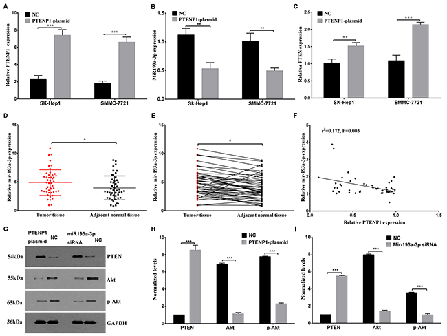 Figure 2: PTENP1 modulated the expression of miR-193a-3p and induced the regulation of the PTEN/Akt pathway. (A) The PTENP1 level was analyzed after SK-Hep1 and SMMC-7721 cells were transfected with the PTENP1 plasmid or negative control plasmid. (B) The overexpression of PTENP1 might downregulate the miR-193a-3p expression level in SK-Hep1 and SMMC-7721 cells through ceRNA regulation mechanism. (C) The relative PTEN mRNA expression was evaluated in SK-Hep1 and SMMC-7721 cells transfected with the PTENP1 plasmid or negative control plasmid. (D) and (E) The miR-193a-3p expression level was higher in HCC tissues than in the paired adjacent normal tissues as determined by qPCR. (F) The negative association between PTENP1 and miR-193a-3p was detected by bivariate correlation analysis of 48 pairs of HCC tissues. (G), (H) and (I) The PTEN/Akt pathway was analyzed by western blot assay after the upregulation of PTENP1 or the downregulation of miR-193a-3p in SMMC-7721 cells. The relative protein expression is presented. All values are the means ± SD, n=3.
