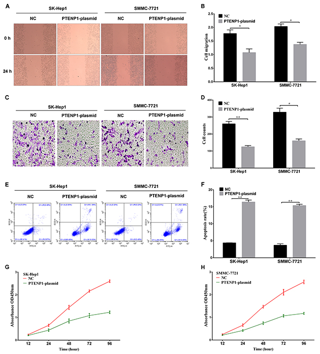Figure 3: The functional analysis of PTENP1 in HCC cells. (A) and (B) The wound-healing assay was applied to analyze the cell migration ability after PTENP1 was upregulated in SK-Hep1 and SMMC-7721 cells. (C) and (D) Cell invasion capacity was detected by transwell assay in SK-Hep1 and SMMC-7721 cells transfected with PTENP1-plasimd or negative control. (E) and (F) Flow cytometry assays were performed to analyze the cell apoptosis of SK-Hep1 and SMMC-7721 cells after treatment with PTENP1-plasimd or negative control. (G) and (H) MTT assay was used to evaluate the proliferation ability in SK-Hep1 and SMMC-7721 cells (P < 0.05). Data was expressed as means ± SD, n=3. *P < 0.05, **P < 0.01.