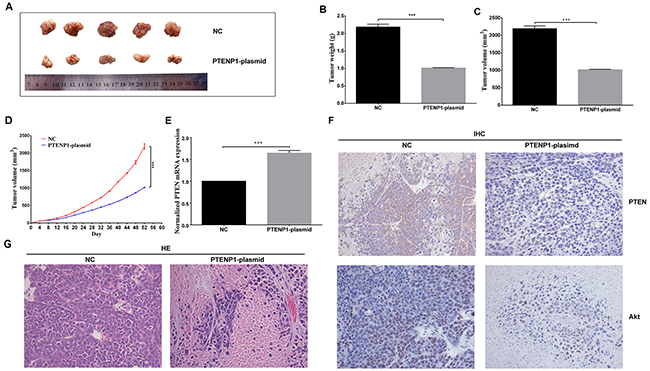 Figure 5: PTENP1 overexpression repressed HCC growth in vivo. (A) Photographs of HCC tissues obtained from the different groups transfected with PTENP1-plasimd and negative control in nude mice. (B), (C) and (D) Tumor weight, tumor volumes, and growth curve of tumor volumes were evaluated. The average volume and weight of HCC tumors in PTENP1-plasimd group were significantly lower than those of in the NC group. (E) In vivo, the overexpression of PTENP1 increased the PTEN level than the negative control. (F) The protein expression of PTEN, and Akt were analyzed by IHC assay in HCC. (G) Sections of xenograft tumors were stained by hematoxylin and eosin (HE). The PTENP1-plasimd group increased more necrosis cells than the control. Data was expressed as means ± SD, n=3. ***P < 0.001.