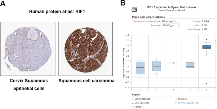 RIF1 protein expression in human cervical cancer tissues and normal tissues was determined from the human protein atlas (www.proteinatlas.org). RIF1 gene expression was determined through data from Oncomine database (www.oncomine.org).