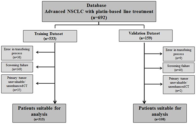 Out of 692 patients with contrast-enhanced CT scans screened, 421 (60.8%) were suitable for histogram analysis. Patients were divided into the training dataset (n=313) and the validation dataset (n=108). The main reason for exclusion from the training dataset were screening failure (due to < stage IV at inclusion, absence of platinum-based treatment, other histology than NSCLC and baseline CT not available) followed by errors in the transferring process and non-evaluable primary tumor. Screening failure was also the main reason for exclusion in the validation dataset (Figure 1).