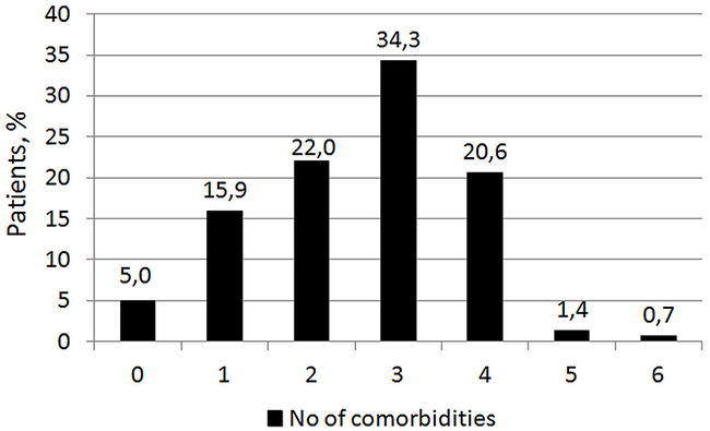 The presence of multiple comorbid conditions among T2DM patients with STEMI was high. Majority of patients have at least 2 other cardiovascular comorbidities and almost half of the patients had one or two non-cardiovascular comorbidities. Reasons for increased multimorbidity include older age and the presence of T2DM. The largest burden on multimorbidity in T2DM can be attributed to cardiovascular disease, metabolic/endocrine/nutritional conditions and kidney disease [7, 16]. Both the median number of comorbidities as well as the prevalence of multimorbidity was similar to that described in other studies [12, 14, 15, 17]. In our study, hypertension was the most prevalent comorbidity (72.2% in the whole population), followed by hyperlipidemia (48.7%) and heart failure (45.0%). Our results are consistent with data from other studies where the prevalence of hypertension ranged from 50% to 75% [12, 13, 17]. In terms of non-CVD comorbidities, we found that CKD, anemia, and COPD were most prevalent. This, in part, supports earlier findings [14, 18]. However, in contrast to our findings others report depression [18] and GI bleeding/ulcer [19] to be diagnosed in a significant proportion of the studied population. Radovanovic et al studied over 30 000 patients who were enrolled into the AMIS Plus registry and found that 7%, 6%, and 2% of patients were reported to have kidney disease, lung disease, and GI ulcer respectively [15]. Gili et al investigated the effect of comorbidities on in-hospital mortality of more than 5 000 patients with AMI and reported the rates of kidney disease, lung disease, depression, and GI ulcer to be 11%, 16%, 4%, and 0.5% [17].