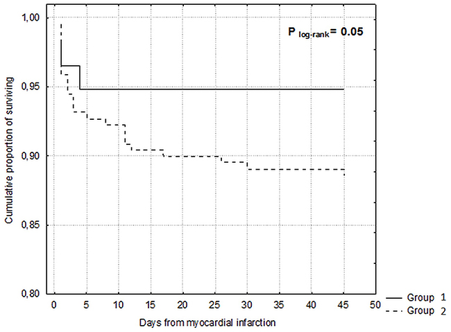 A total of 277 patients with T2DM and STEMI undergoing primary percutaneous coronary intervention (PCI) were enrolled. Based on the number of comorbidities the study population was divided into two groups: group 1 (N=58) with ≤ 1 comorbidity and group 2 (N=219) with ≥ 2 comorbidities.