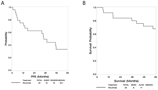 At a median follow-up of 60 months, the median PFS was 34.1 months (95% CI: 12.2-60.1+), and median OS had not been reached as depicted in Figures 1A and 1B. Two year PFS was 63%. In an exploratory analysis, subjects older than 60 had similar progression free survival but a trend toward inferior overall survival compared with subjects younger than age 60.