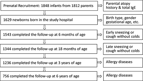 Figure 1: Summary of the birth cohort study. A total of 1848 infants from 1812 pairs of parents were prenatally recruited. Of the enrolled newborns, 1543, 1344, 1236 and 756 completed follow-up at 6 months, 18 months, 3 years and 6 years of age, respectively.