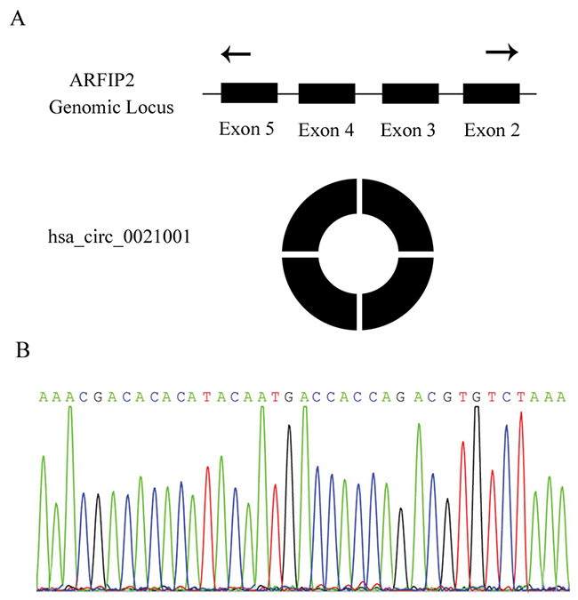 Figure 1: Identification of hsa_circ_0021001 in IA patients. (A) hsa_circ_0021001 is produced at the ARFIP2 gene locus containing exon 2-5; (B) Sanger sequencing of hsa_circ_0021001 showed the back-splice junction.