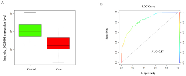 Figure 2: Hsa_circ_0021001 expression level in IA development. (A) hsa_circ_0021001 expression in the experimental and control groups; (B) ROC curve for detection of the diagnostic efficiency of hsa_circ_0021001 in IA with an AUC of 0.87, a sensitivity of 0.81 and a specificity of 0.92. ROC curve: Receiver Operating Characteristic curve; AUC: area under the ROC curve.