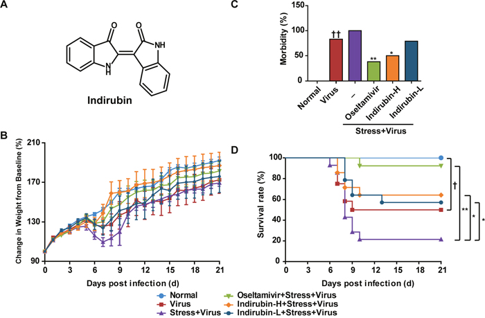 Figure 1: Indirubin attenuates the morbidity and mortality caused by influenza infection in stressed mice. Chemical structure of indirubin (A). Effects of indirubin on body weight changes (B), morbidity (C) and survival rate (D) of mice after influenza infection. “-” indicates no treatment. Indirubin-H and Indirubin-L respectively represent the higher dose of indirubin (5 mg·kg-1·d-1) and the lower dose of indirubin (2.5 mg·kg-1·d-1). The difference was considered statistically significant at †P < 0.05 vs. Virus group; *P < 0.05 and **P < 0.01 vs. “Stress+Virus” group. Data were obtained from 10 - 14 animals in each group.