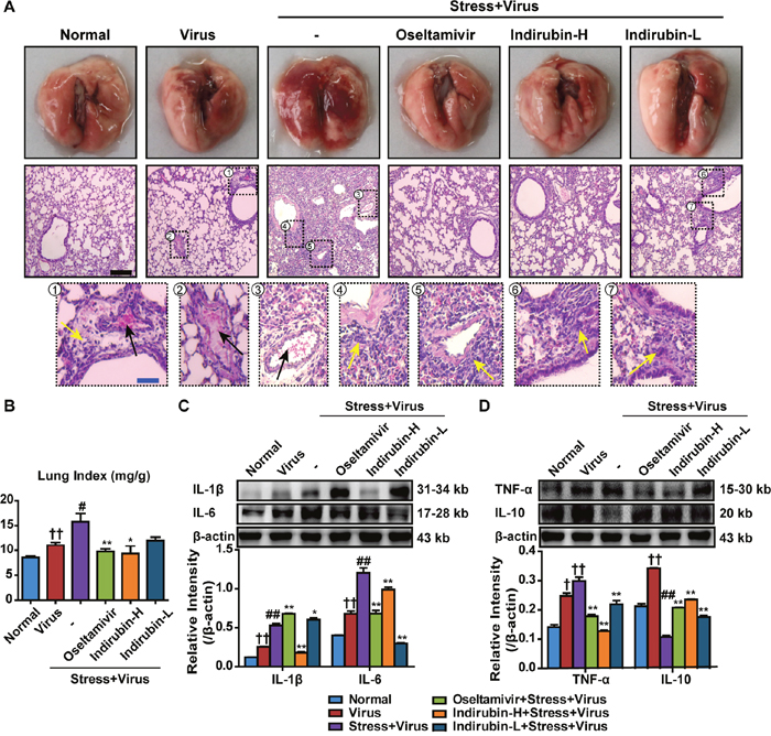 Figure 2: Indirubin protects against pneumonia caused by influenza infection in stressed mice. (A) Histologic sections of lung tissues on the 5th day after influenza virus challenge, stained by H&E to exam histopathologic changes (Black scale bar = 100 μm, Blue scale bar = 25 μm). Black arrows represent congesting vessels and yellow arrows stand for inflammatory cells infiltration. (B) Effects of indirubin administrations on the lung index in H1N1-infected restraint-stressed mice. The protein expressions of IL-1β, IL-6 (C), TNF-α and IL-10 (D) in the lung tissues. “-” indicates no treatment. Indirubin-H and Indirubin-L respectively represent the higher dose of indirubin (5 mg·kg-1·d-1) and the lower dose of indirubin (2.5 mg·kg-1·d-1). The difference was considered statistically significant at †P < 0.05, ††P < 0.01 vs. Normal group; #P < 0.05, ##P < 0.01 vs. Virus group; *P < 0.05, **P < 0.01 vs. “Stress+Virus” group. Data are expressed as mean ± SEM from 3 independent determinations.