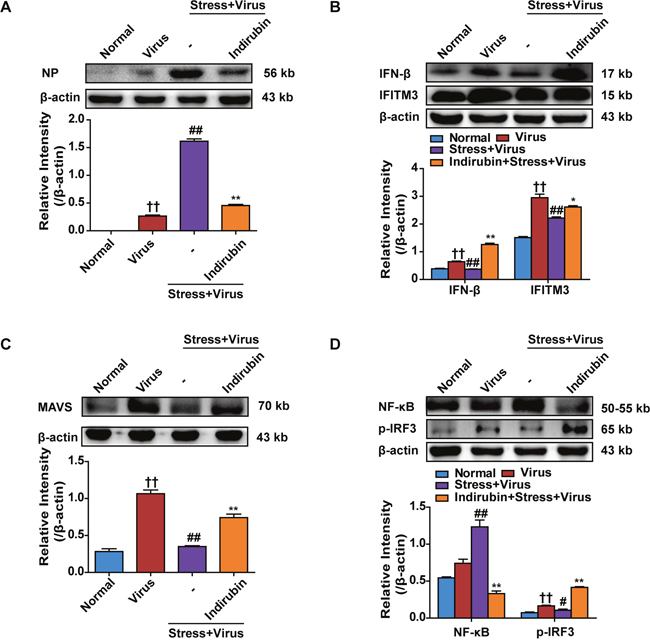 Figure 3: Indirubin promotes IFN-β generation through MAVS antiviral signaling after influenza infection in stressed mice. The protein expressions of NP (A), IFN-β, IFITM3 (B), MAVS (C) and p-IRF3, NF-κB (D) in the lung tissues on the 5th day post infection. “-” indicates no treatment. The difference was considered statistically significant at ††P < 0.01 vs. Normal group; #P < 0.05, ##P < 0.01 vs. Virus group; *P < 0.05, **P < 0.01 vs. “Stress+Virus” group. Data are expressed as mean ± SEM from 3 independent determinations.