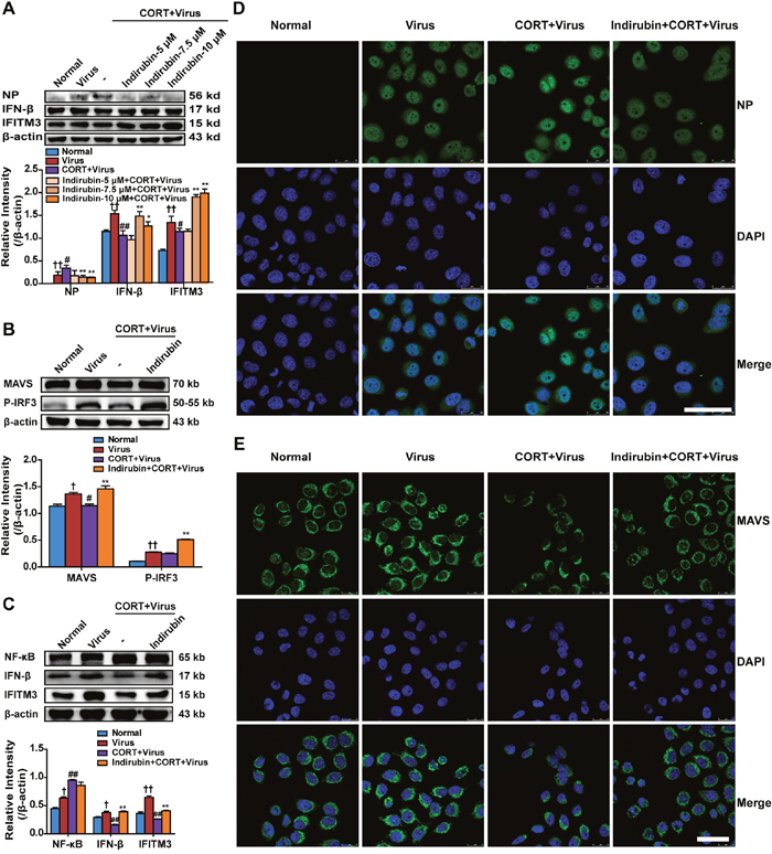 Figure 4: Indirubin promotes IFN-β generation through MAVS antiviral signaling after influenza infection in CORT-loaded A549 cells. NP, IFN-β and IFITM3 protein expressions in CORT-loaded A549 cells treated with different concentrations of indirubin (A). The protein expressions of MAVS, p-IRF3 (B), NF-κB, IFN-β and IFITM3 (C) in A549 cells. “-” indicates no treatment. The difference was considered statistically significant at †P < 0.05, ††P < 0.01 vs. Normal group; #P < 0.05, ##P < 0.01 vs. Virus group; *P < 0.05, **P < 0.01 vs. “CORT+Virus” group. Data are expressed as mean ± SEM from 3 independent determinations. H1N1-infected CORT-loaded A549 cells were fixed and stained for NP (D) and MAVS (E) expression (representative images from n = 3 per group, NP and MAVS: green, DAPI nuclear stain: blue, scale = 50 μm).