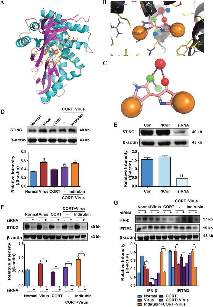 Figure 5: STING is involved in the regulation of IFN-β production by indirubin. The structure of indirubin bound to STING (A). An expanded view of the indirubin-binding pocket in the STING (B). Blue spheres represented THR266 residue and THR266 residue of STING protein, respectively. Binding mode between indirubin and STING (C). The protein expressions of STING (D, E) in A549 cells. The difference was considered statistically significant at ††P < 0.01 vs. Normal group; ##P < 0.01 vs. Virus group; *P < 0.05 vs. “CORT+Virus” group. Data are expressed as mean ± SEM from 3 independent determinations. The protein expressions of STING (F), IFN-β and IFITM (G) in A549 cells with or without siRNA transfection of STING. *P < 0.05, **P < 0.01. “-” indicates no treatment. Data are expressed as mean ± SEM from 3 independent determinations.