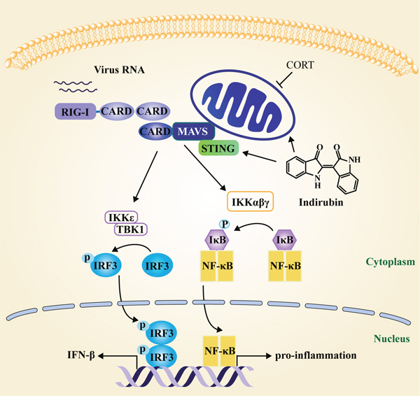 Figure 7: Schematic diagram of the mechanism of indirubin-induced attenuation of H1N1 pathogenesis in the susceptible model. MAVS localizes to mitochondria to exert an anti-viral effect. H1N1 infection triggers host cell activation of the NF-κB and IRF3 signaling pathway following MAVS sensing. STING acts as a mitochondria cofactor for MAVS signaling to promote NF-κB and IRF3 production. CORT impacts the function of mitochondria, which has adverse effects on MAVS signaling. Indirubin promotes the production of IFN-β and IFITM3 by recovering MAVS signaling and maintaining mitochondrial function affected by CORT in the susceptible model. Moreover, indirubin is found to promote MAVS signaling by regulating STING following influenza A virus infection. In addition, indirubin attenuates NF-κB dependent pro-inflammatory cytokine production to alleviate pneumonia in restraint-stressed mice.
