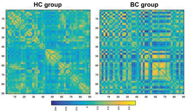 Figure 1: The mean correlation matrices within each group. HC, healthy control; BC, breast cancer.