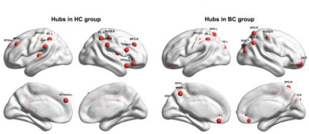 Figure 3 shows spatial distribution of hubs for each group. In the HC group, we identified 14 hub regions, including 10 association cortex regions, two paralimbic cortex regions and two primary cortex regions. These hubs were mainly located in frontal/prefrontal (the bilateral middle frontal gyri, the opercular part of the right inferior frontal gyrus, the orbital part of the right inferior frontal gyrus, the right rolandic operculum, and the left medial superior frontal gyrus), parietal (the bilateral postcentral gyri, the bilateral inferior parietal, but the supramarginal and angular gyri and the bilateral supramarginal gyri), and temporal (the left superior temporal gyrus and the right temporal pole: superior temporal gyrus) regions. In the BC group, we identified fifteen hub regions, including eight association cortex regions, five paralimbic cortex regions, and two primary cortex regions. These hubs were predominantly located in parietal (the bilateral postcentral gyri, the bilateral superior parietal gyri, the left inferior parietal, but the supramarginal and angular gyri, the right angular gyrus, and the left precuneus), prefrontal (the orbital part of the bilateral superior frontal gyrus, the orbital part of the right middle frontal gyrus, and the bilateral gyrus rectus), and occipital (the bilateral superior occipital gyri and the right middle occipital gyrus) regions. Notably, only three regions were commonly identified as hubs in both groups, including the bilateral postcentral gyrus and the left inferior parietal, but the supramarginal and angular gyri).