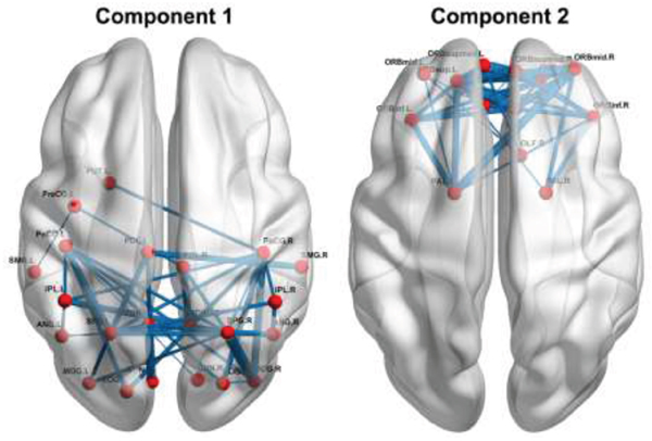 Figure 5: Increased functional connectivity in the patients. Refer to Table 3 for regional abbreviations.