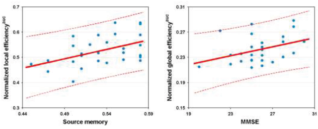 Significantly positive correlations were observed between normalized global efficiency and the MMSE scores (r = 0.398, P = 0.036) and between normalized local efficiency and the source memory scores (r = 0.497,P = 0.01) in the patients (Figure 6). Of note, these correlations did not survive after correcting for multiple comparisons (P> 0.05, corrected by the False Discovery Rate procedure). No significant correlations were found between other network/connectivity measures and cognitive variables(all P > 0.05).