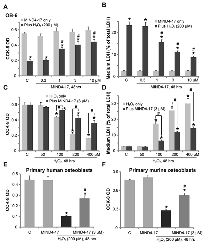 Figure 1: MIND4-17 protects human osteoblasts from hydrogen peroxide. OB-6 human osteoblastic cells (A-D), the primary human osteoblasts (E) or the primary murine osteoblasts (F) were pretreated for 1 hour with applied concentration of MIND4-17, following by the hydrogen peroxide (“H2O2”) treatment, cells were further cultured for additional 48 hours in the conditional medium; Cell viability (CCK-8 assay, A, C, E and F) and cell death (LDH release assay, B and D) were tested. Data were presented as mean (n=5) ± standard deviation (SD). “C” stands for medium treatment control (Same for all figures). *p<0.05 vs. “C” cells. #p<0.05 vs. H2O2 only group. Experiments in this figure were repeated for four times, and similar results were obtained.
