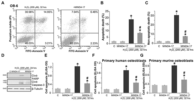 Figure 2: MIND4-17 inhibits H2O2-induced apoptotic and non-apoptotic cell death of osteoblasts. OB-6 human osteoblastic cells (A-E), the primary human osteoblasts (F) or the primary murine osteoblasts (G) were pretreated for 1 hour with MIND4-17 (3 μM), following by hydrogen peroxide (“H2O2”, 200μM) treatment, cells were then cultured for the indicated time period and were subjected to assays mentioned in the text to examine apoptotic and non-apoptotic cell death. Data were presented as mean (n=5) ± standard deviation (SD). *p<0.05 vs. “C” cells. #p<0.05 vs. H2O2 only group. Experiments in this figure were repeated for three times, and similar results were obtained.