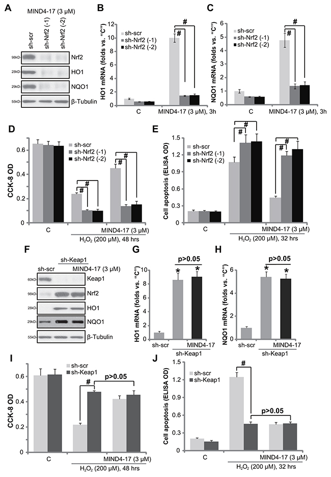 Figure 5: Nrf2 activation is required for MIND4-17-mediated cytoprotection. OB-6 cells, stably expressing lentiviral scramble non-sense control shRNA (“sh-scr”) or Nrf2 shRNA (“sh-Nrf2, sequence -1/-2”) (A-E), as well as lentiviral Keap1 shRNA (“sh-Keap1”) (F-J), were treated with MIND4-17 (3 μM) for 3 hours, expressions of listed proteins were presented (A and F); mRNA expressions of listed genes were also shown (B, C, G and H); Cells were further treated with/out hydrogen peroxide (“H2O2”, 200 μM) for indicated time period, cell viability (CCK-8 assay, D and I) and apoptosis (Histone DNA ELISA assay, E and J) were also tested. For H2O2 experiments, MIND4-17 (3 μM) were pretreated before H2O2 for 1 hour. For all the assays, the exactsame number of viable cells with the applied shRNA was initially plated into each well. Data were presented as mean (n=5) ± standard deviation (SD). #p<0.05. Experiments in this figure were repeated for three times, and similar results were obtained.